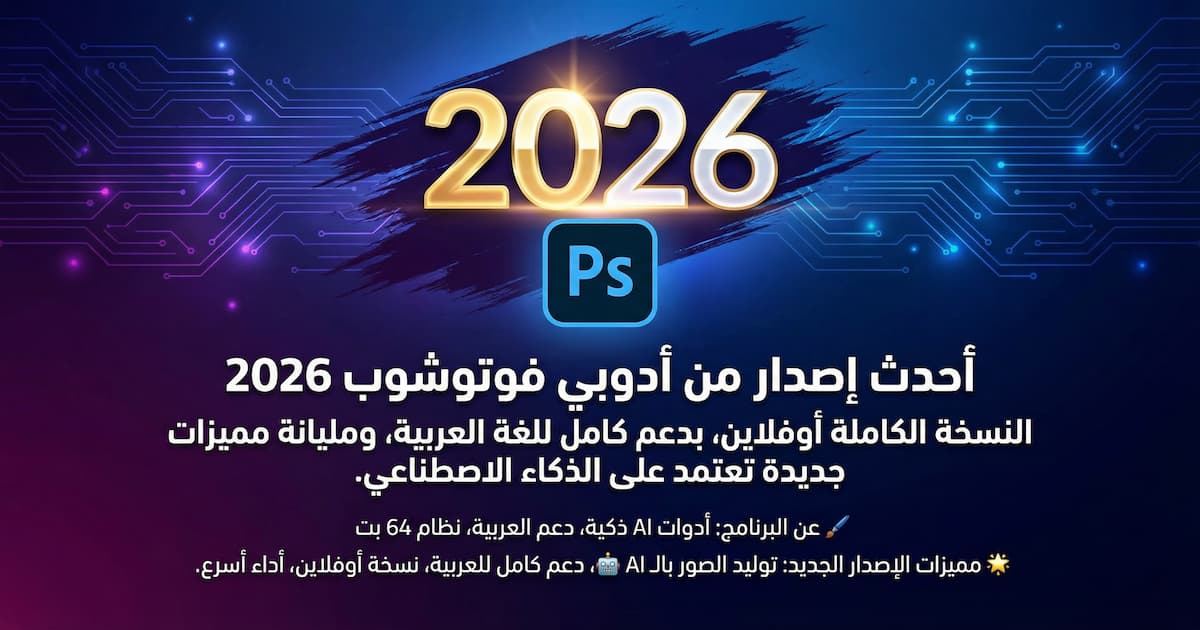 دلوقتي تقدر تحمل أحدث إصدار من أدوبي فوتوشوب 2026 💥 النسخة الكاملة أوفلاين، بدعم كامل للغة العربية، ومليانة مميزات جديدة تعتمد على الذكاء الاصطناعي لتسهيل شغلك وإبداعك.