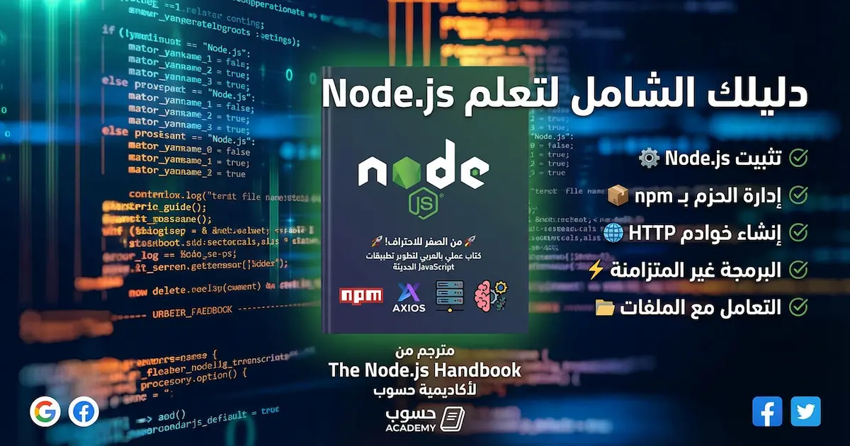 الكتاب مترجم من The Node.js Handbook للكاتب Flavio Copes، ومتوفر من خلال أكاديمية حسوب بالعربية - يعني هتتعلم خطوة بخطوة بلُغة بسيطة وواضحة.ابدأ رحلتك في عالم تطوير التطبيقات الحديثة بـ Node.js وخلّي JavaScript تبني المستقبل معاك 🚀